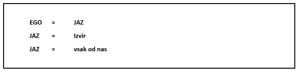 EGO v latinščini pomeni JAZ. Vsi in vsak od nas smo del Izvira, ki je JAZ, zato smo tudi vsi in vsak od nas svoj JAZ in del višjega JAZ-a, Izvira.