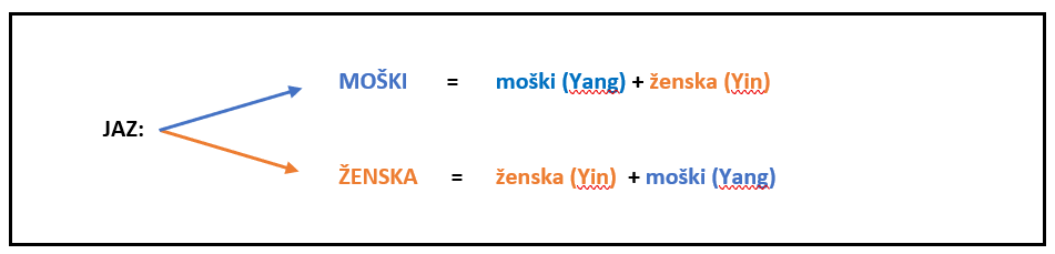 Vsak od nas, vsak JAZ, je bodisi Moški bodisi Ženska, pri čemer vsak moški v sebi nosi tudi ženske (Yin) značilnosti, vsaka ženska pa ima tudi moške (Yang) lastnosti.