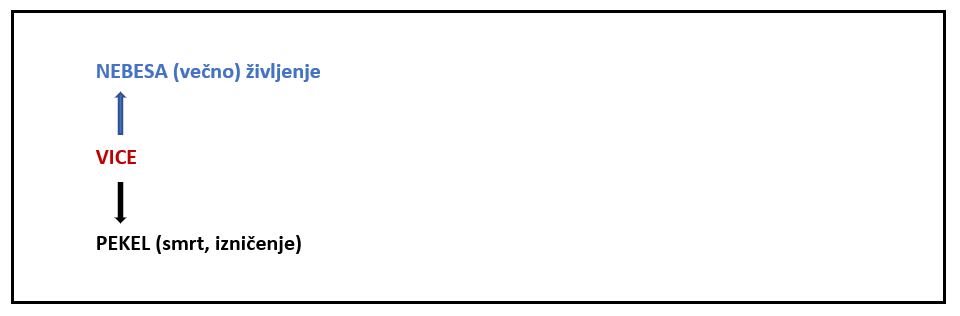 Zaradi izvirne napake vsak od nas, vsak JAZ, v sebi nosi dobro in zlo. Vsi živimo v ‘vicah’ in vsi imamo na razpolago dve poti. Pot v ‘pekel’ in izničenje in pot v ‘nebesa’ in (večno) življenje. Od naših dejanj pa je odvisno, po kateri od njiju stopamo.