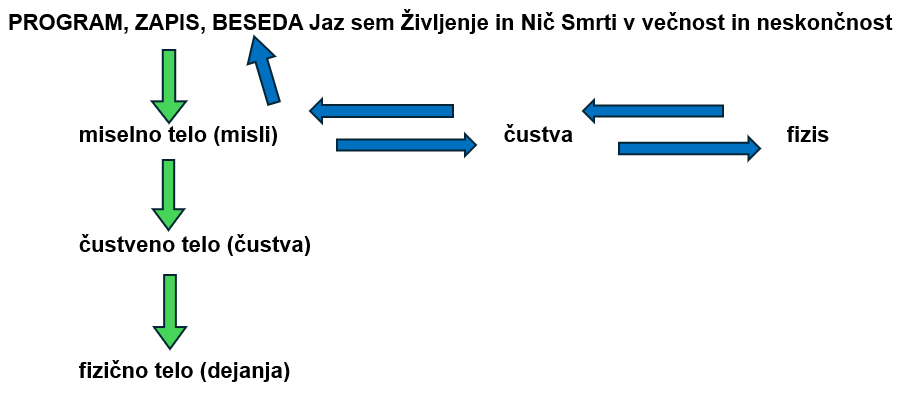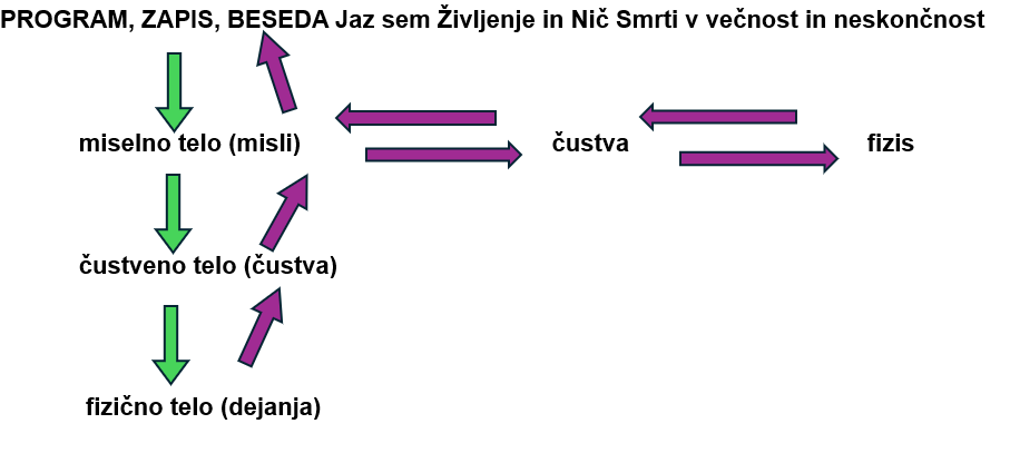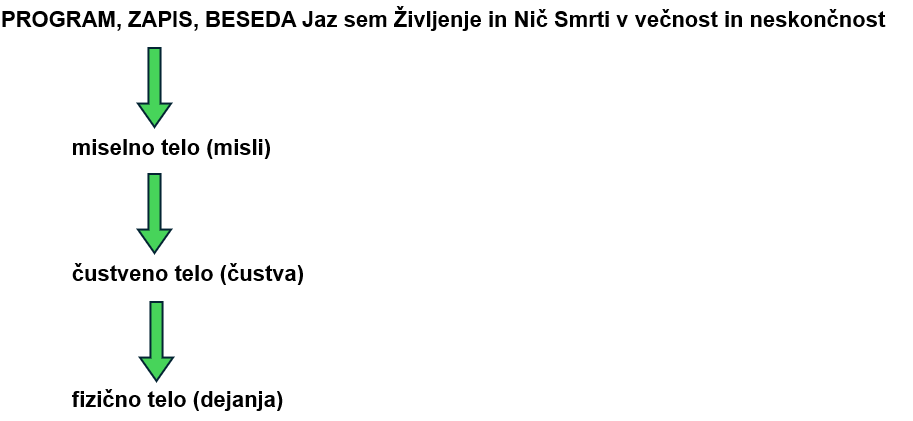 Zaradi navedenega po novem programu Jaz sem Življenje in Nič Smrti v večnost in neskončnost (amen) v prehodnem obdobju (dokler ne bo popravila preteklih napak) zgoraj (v zapisu) ni enako kot spodaj (v materiji), saj je v zgoraj (v zapisu, v energiji, ideji) Narava že postala brezmadežna, brez napak, brez Smrti, spodaj v materiji pa še ne. Pa tudi potem, ko bo prepoznala in popravila vse svoje pretekle napake, v prihodnje pa bo vse najprej premislila (predvidela) in šele potem udejanjila, bodo njene misli tudi v bodoče dobre in slabe. Zato zgoraj (v zapisu) ne bo enako kot v njenih mislih. Ker pa bo potem po tem programu dobre misli materializirala, slabih pa ne, bodo napake, torej Smrt, dejansko obstajale samo v njenih mislih. Ker pa bo tudi te zaradi programa, ki od Narave zahteva, da je samo Življenje in Nič Smrti v večnost in neskončnost, popravljala oz. jih ne bo udejanjala, bo Smrt (napaka) o(b)stajala le še kot zgodovina v njenem spominu. Zaradi katerega napak tudi ne bo ponavljala. Misli se bodo torej sproti čistile, zato bo zgoraj (v zapisu) spet enako kot spodaj (v materiji). Torej samo Življenje in Nič Smrti v večnost in neskončnost. Kar je ob stalni odsotnosti Smrti recept za (njeno) večno življenje.