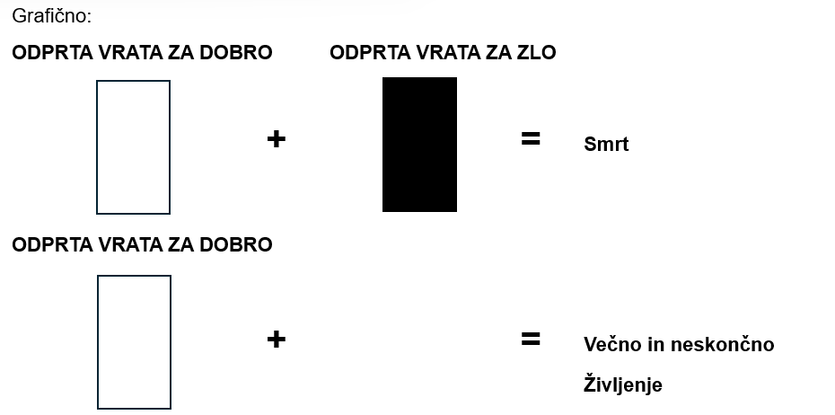 Tako zaradi izvirne napake tudi vsi ljudje v sebi nosimo dvoja vrata, vrata za dobro in vrata za zlo, ki so vseskozi odprta v obe smeri. Z molitvami k Bogu krepimo v sebi Življenje, vendar pa vrat za zlo s tem ne zapremo. Zato tudi če molimo le k dobremu, skozi druga vrata zlo, ki ga je s časom vedno več (zakaj je temu tako, sem že pojasnila v drugih svojih člankih), čeprav tega ne vemo oz. nočemo, stalno prihaja v nas. Tudi če ‘hudiča’ izganjamo, vrat za zlo s tem ne zapremo, zato se to vrne nazaj lahko v še hujši obliki. Če se preveč razdajamo in pri tem ne (po)skrbimo zase, skozi vrata za dobro svojo življenjsko energijo izgubljamo, iz okolja pa je, ker je je tam vedno manj, dobivamo vedno manj. Tako se vedno bolj izčrpavamo in kljub dobrim delom in molitvam k dobremu je v nas vedno več Smrti in vedno manj Življenja. Moč Smrti raste, moč Življenja šibi in sčasoma se Življenje v nas utrudi od stalnega boja z zlom in kolabira. Začnemo se starati, vedno bolj zbolevamo in težje ozdravimo in na koncu nas čaka neizbežna smrt.