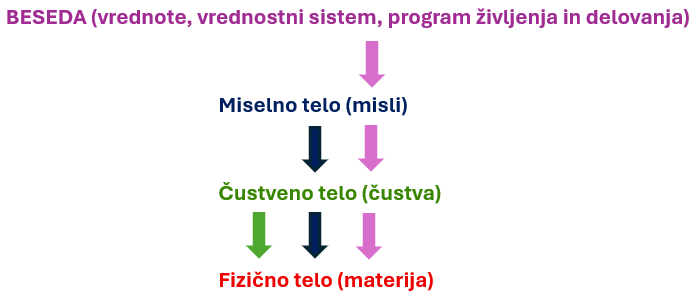 Z delovanjem na fizično telo torej lahko spreminjamo samo tega, pa še to le delno in začasno, če Beseda ostaja nespremenjena. Če spremenimo čustveno telo, spremenimo tega in s časom vplivamo tudi na fizis, vendar pa spet samo delno in začasno, če Beseda ostaja nespremenjena. S spremembo misli s časom spremenimo tudi čustveno in fizično telo, če Beseda ostaja nespremenjena, pa je to ponovno le delno in začasno.