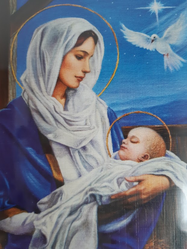 Bil je čas okoli novega leta. Številne firme so nam pošiljale reklame za svoje čestitke in med njimi se je znašla tudi čudovita slika Marije, naslikal pa jo je umetnik, ki slika z usti. Prepričana sem, da lepše slike, tudi če bi jo iskala, ne bi našla. Tako mi je bila všeč, da sem jo takoj uokvirila in umetnina sedaj krasi našo dnevno sobo. Velikokrat jo pogledam in ob tem začutim mir. In hvaležnost. Hvala, vesolje, da si mi uresničilo željo.